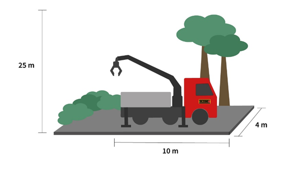 • Ytan där kranbilen ska stå parkerad ska vara tillräckligt stor för att kunna rymma kranbilen och dess fullt utfällda stödben enligt nedan bild. Höjden som kranbilen behöver för att kunna utföra tjänsten varierar och i fullt utfällt läge behövs en fri yta ovanför kranbilen på ca 25 meter.